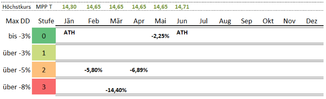 Der letzte absolute Höchstkurs des MPP (T) lag per 21.02.2020 bei 14,65 Euro und wird so lange weitergeführt, bis ein neues Allzeithoch (ATH) erreicht wird. Per Ende Februar 2020 lag der Fondspreis des MPP (T) bei 13,80 €uro und der berechnete MaxDD bei -5,80%, den Sie in der Stufe 2 eingetragen sehen. Per 22.06.2020 ergibt sich der MaxDD bei null (ATH).