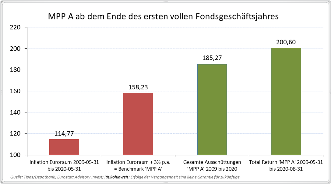 Die nächste Ausschüttung findet am 2. August 2021 statt. Geplant sind wiederum 0,41 Euro pro Stück Fondsanteil MPP A. Bei einem aktuellen NAV von 6,83 Euro errechnet sich eine Ausschüttungs-Rendite in Höhe von 6,00% gemäß OeKB- bzw. BVI-Methode.
