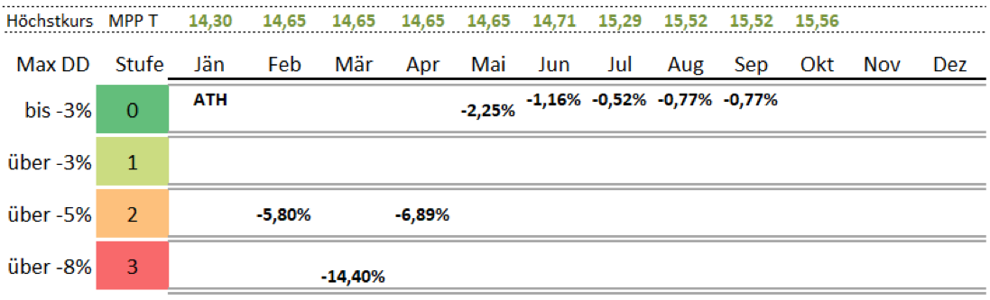 Der letzte absolute Höchstkurs des MPP (T) lag per 19.08.2020 bei 15,52 Euro und wird so lange weitergeführt, bis ein neues Allzeithoch (ATH) erreicht wird. Per Ende Februar 2020 lag der Fondspreis des MPP (T) bei 13,80 €uro und der berechnete MaxDD bei -5,80%, den Sie in der Stufe 2 eingetragen sehen. Per 30.09.2020 ergibt sich der MaxDD bei -0,77%.