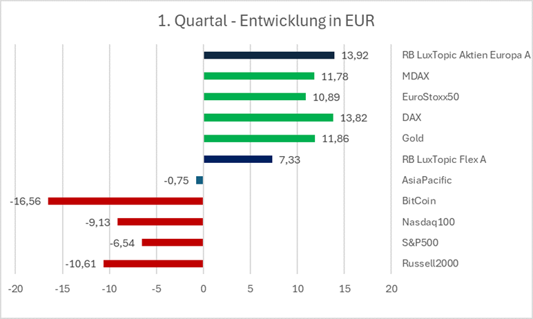 Im März wich an den globalen Aktienmärkten die Euphorie vom Jahresanfang inzwischen einer Schockstarre. Während europäische Titel im ersten Quartal zweistellig zulegen konnten, haben ihre US-Pendants kräftig Federn lassen müssen. Zu unsicher scheint, was durch die Trump-Politik für Schaden angerichtet wird. In diesem volatilen Marktumfeld legte der RB LuxTopic – Flex B EUR (WKN A2P6A3, ISIN LU2185964876) insgesamt zu und verzeichnete im ersten Quartal ein Plus von +5,70 Prozent. FondsManager Robert Beer geht in seinem Monatsreport für März der Frage nach, wie man der gegenwärtigen Schockstarre begegnen kann und berichtet zugleich über die Portfolio-Zusammensetzung seines global anlegenden Fonds.
