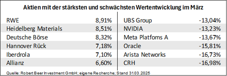 Während europäische Titel im ersten Quartal zweistellig zulegen konnten, haben ihre US-Pendants kräftig Federn lassen müssen. Die Euphorie vom Jahresanfang ist inzwischen einer Schockstarre gewichen. Zu unsicher scheint, was durch die Trump-Politik für Schaden angerichtet wird. Vom Profit durch Deregulierung spricht inzwischen kaum jemand mehr. Ein Blick auf Gewinner und Verlierer im ersten Quartal (Stand 28.03.2025, eigene Recherche) spricht Bände: