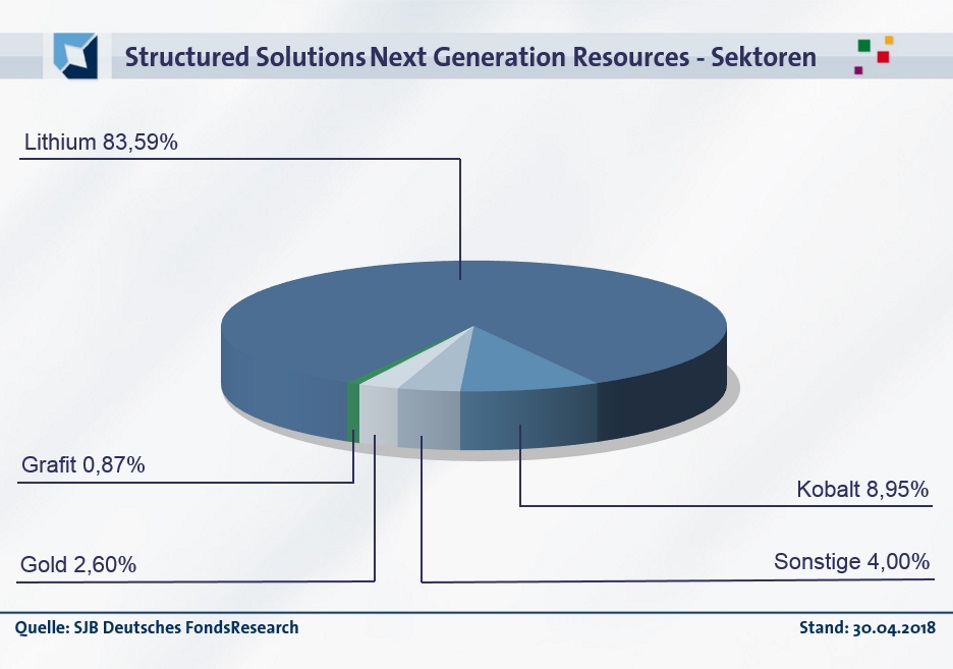 In der geographischen Allokation des Structured Solutions Next Generation Resources Fund liegt Südamerika mit 39,37 Prozent auf dem ersten Platz. 37,52 Prozent des FondsVolumens sind in Aktien nordamerikanischer Rohstoffproduzenten investiert. Auf dem „fünften Kontinent“ Australien hat FondsManager Tobias Tretter 21,80 Prozent des FondsVermögens angelegt. Sonstige geographische Regionen besitzen mit einem Anteil von 1,32 Prozent lediglich den Status einer Beimischung. Bei der Aufteilung des FondsVermögens auf die entsprechenden Rohstoffsektoren ist die klare Schwerpunktlegung unverkennbar: 83,59 Prozent des Portfolios sind im Lithium-Sektor investiert. Die Sektorenverteilung im Rohstoffbereich wird durch einen 8,95-prozentigen Anteil an Kobalt-Produzenten fortgeführt. Sonstige Rohstoffproduzenten der „Next Generation“ aus Bereichen wie z.B. Magnesium machen 4,00 Prozent des FondsVolumens aus. Abgerundet wird das FondsPortfolio durch Minenunternehmen aus dem Goldsektor (2,60 Prozent) sowie Grafit-Produzenten (0,87 Prozent). Größte Einzelposition im Structured Solutions Next Generation Resources Fund ist per Ende April die Aktie von Nemaska Lithium Inc. mit einem Portfolioanteil von 7,83 Prozent. Wie FondsManager Tretter berichtet, hat gerade erst der japanische Softbank-Konzern für eine Summe von rund 100 Millionen Kanada-Dollar 9,9 Prozent der Anteile an dem Lithiumproduzenten erworben – ein Zeichen für die Attraktivität des Unternehmens. Eine weitere Top-Position sind die Aktien der Albemarle Corporation (4,87 Prozent des FondsVermögens), dem aktuell weltgrößten Lithium-Produzenten. Der Lithium-Preis von 10.000 USD je Tonne, mit dem Rohstoffexperte Tretter innerhalb seines Fonds kalkuliert, würde dem Unternehmen für seine zukünftige Produktion weiter eine sehr rentable Marge garantieren.