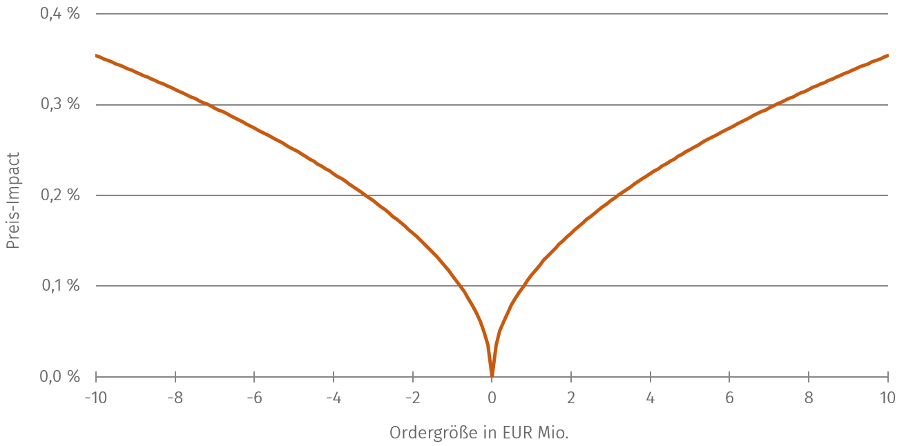 Obwohl die Funktion grundsätzlich recht simpler Natur ist, beobachten wir in Summe einen sehr stabilen Zusammenhang zwischen den Ergebnissen der Formel und den tatsächlich ausgeführten Aktiengeschäften. Des Weiteren finden für weniger liquide Aktien die Geld-Brief-Spanne, Orderbuchtiefe und Tick-Größe Berücksichtigung, indem der zuvor ermittelte Impact durch einen entsprechenden Faktor adjustiert wird.