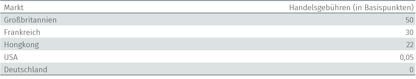 Unter explizite Transaktionskosten fallen sämtliche Kosten, welche im Rahmen des Aktienhandels eindeutig ausgewiesen werden, wie Broker-Kommissionen oder marktspezifische Gebühren. Letztere umfassen Börsengebühren, Finanztransaktionssteuern sowie Stamp Duties. Wenngleich man es nicht vermuten würde, sind diese selbst aus institutioneller Sicht alles andere als zu vernachlässigen. Wie Tabelle 1 verdeutlicht, ist das Bild zwischen ausgewählten Ländern äußerst heterogen. Wohingegen in den USA lediglich marginale Gebühren anfallen, liegen diese in Frankreich bei 30 Basispunkten oder in Großbritannien gar bei 50 Basispunkten. In Deutschland fallen gegenwärtig (noch?) keinerlei derartige Gebühren an.