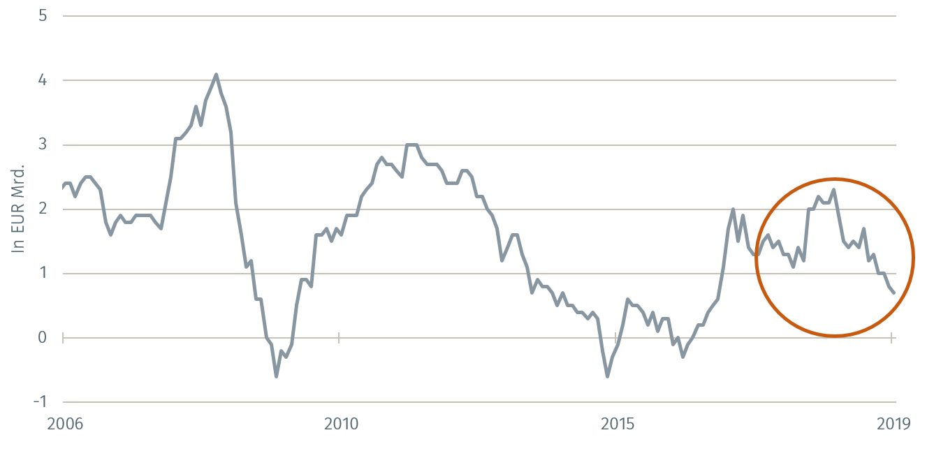 In die gleiche Richtung wirkt der Wechselkurseffekt. Wenn die Preise im Euroraum langsamer steigen als beispielsweise in den USA – was derzeit tatsächlich der Fall ist – dann kommt dies bei konstantem Wechselkurs einer realen Abwertung des Euro gleich. Die europäischen Unternehmen gewinnen gegenüber den amerikanischen an Wettbewerbsfähigkeit. Das ist zwar kein sanftes Ruhekissen, auf dem man sich ausruhen kann. Es hilft aber dem Export in einer Zeit, in der er durch die weltweite Nachfrageschwäche besonders heftigem Gegenwind ausgesetzt ist.