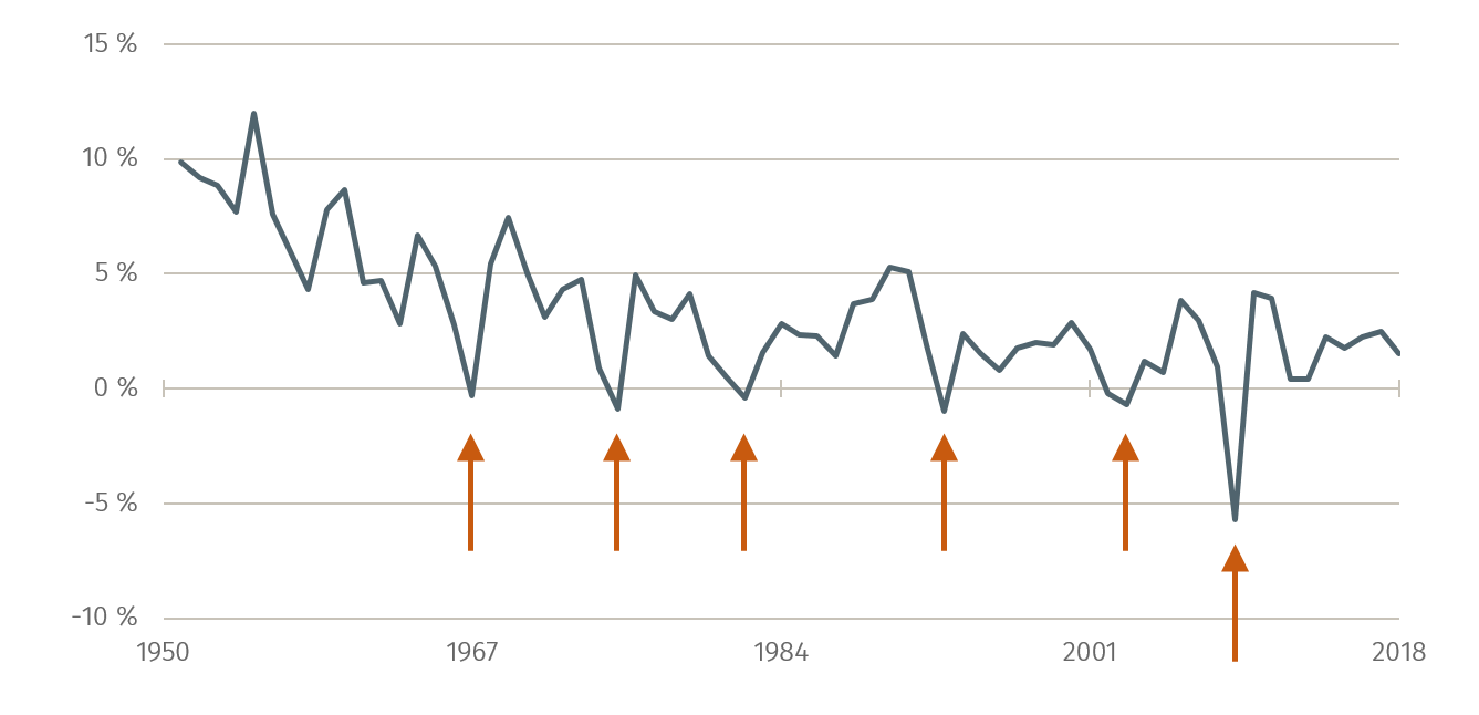 Seit dem zweiten Weltkrieg hat es in Deutschland sechs Rezessionen gegeben, in denen das reale BIP absolut zurückgegangen ist. Das waren jeweils aufregende Zeiten. Regierungen und Zentralbanken setzten alle Hebel in Bewegung, um den Einbruch in Grenzen zu halten.