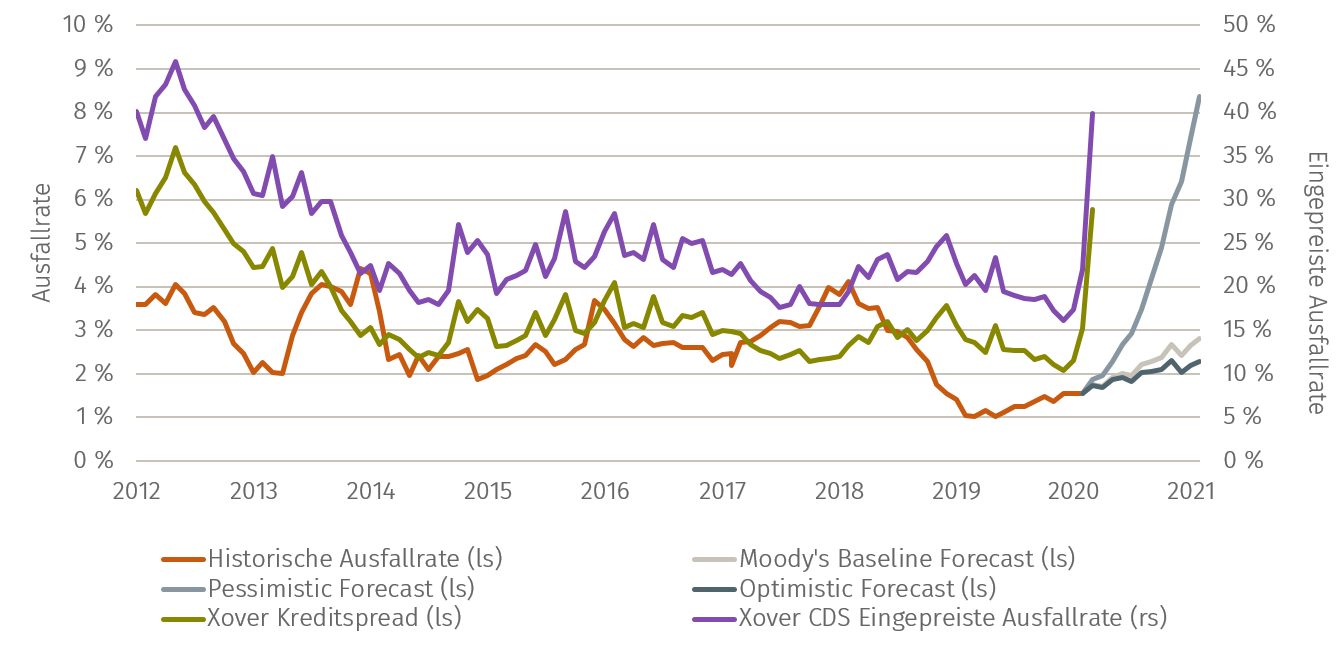 Die Kreditaufschläge haben das höchste Niveau seit der Weltfinanzkrise 2008/2009 erreicht. Der Spread bei Euro High Yield-Anleihen überstieg im März 9 %, während die Spreads bei High Yield Credit Default Swaps (Xover-Index) 7 % erreichten. Es ist zweifellos, dass die Ausfallraten von Unternehmen von den historisch niedrigen Niveaus, die wir in den letzten Jahren beobachtet haben, steigen werden. Die aktuellen Spreads kompensieren jedoch das pessimistischste High Yield Default-Szenario von Moody’s per Ende Februar 2020. Die Fehlermarge hat sich daher deutlich erhöht.