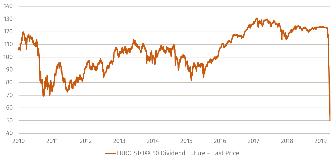 Das Ausmaß der Veränderungen lässt sich anhand einer Reihe von Metriken deutlich erkennen. Erstens zeigt der EURO STOXX Dividenden-Futures-Index, wie drastisch niedrig Dividendenerwartungen am Terminmarkt auf ein Jahr eingepreist sind. Bis zur Gesetzesänderung in Deutschland am 27. März hatte die aufgrund von sozialer Distanzierung erforderliche Verschiebung vieler Hauptversammlungen hierauf auch einen direkten Einfluss. Auch am 27. März veröffentlichte die EZB einen Hinweis an die europäischen Banken, in dem sie den Banken dringend empfiehlt, die Dividendenzahlung bis mindestens Oktober 2020 zu verschieben.