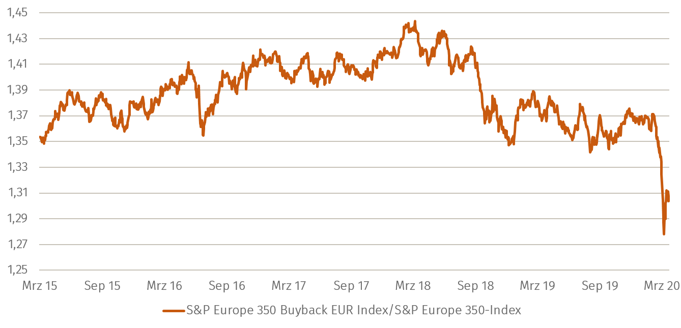 Zweitens: Vergleicht man einen Index europäischer Aktien, die häufig an Aktienrückkäufen beteiligt sind, mit dem Gesamtindex, so zeigt sich hier ein starker Rückgang der Performance aufgrund sinkender Erwartungen.