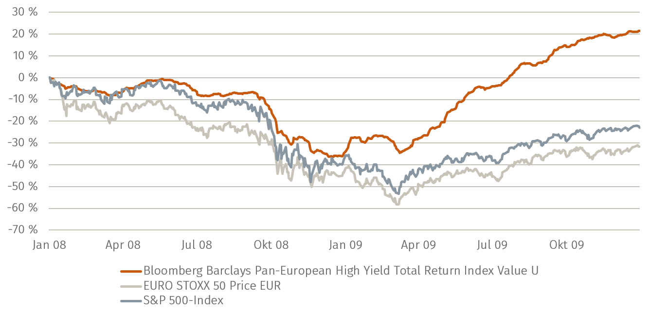 Nach der globalen Finanzkrise 2008/2009 haben sich High Yield-Anleihen schneller und deutlicher erholt als Aktien