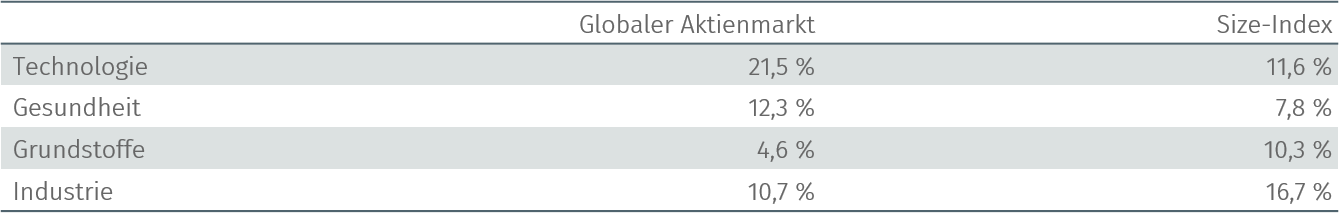 Abseits von Faktorausprägungen zeigt auch die Sektorallokation deutliche Abweichungen relativ zum globalen Aktienmarkt. Durch die Marktentwicklungen in den vergangenen Jahren ist die Konzentration an größeren Unternehmen vor allem in bestimmten Sektoren wiederzufinden. Somit ergibt sich für herkömmliche Size-Ansätze ein strukturelles Problem.