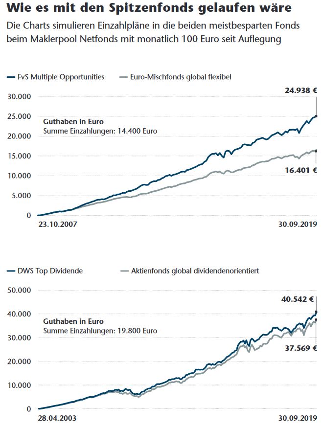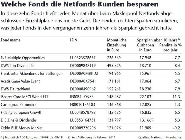 Der DWS fließt immerhin monatlich eine halbe Million Euro in den Top Dividende (DE0009848119). Die anderen Pools haben nicht solche detaillierten Zahlen gemeldet, aber immerhin Ranglisten der meistbesparten Fonds. In jeder dieser Listen stehen der Flossbach-Fonds und der Top Dividende auf den Plätzen 1 und 2. Das sind ohne Zweifel Zuflüsse in Millionenhöhe. Monat für Monat.