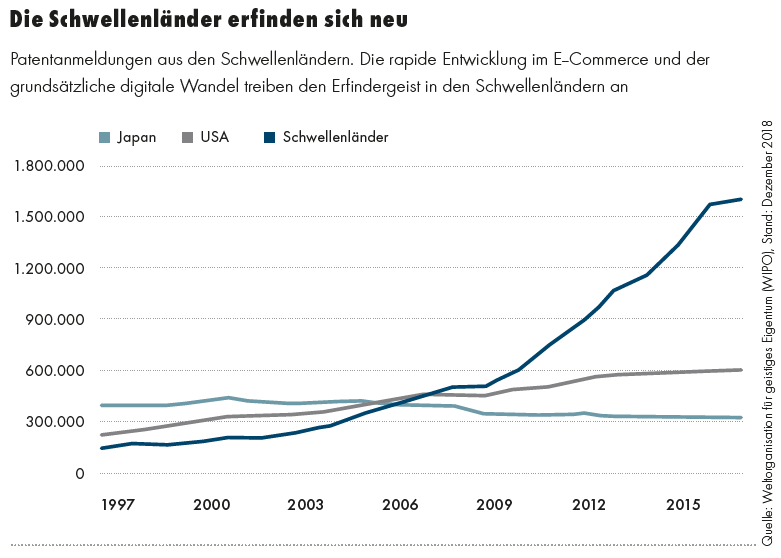Wir teilen diese Meinung nicht. Tatsächlich stehen mehrere Schwellenländer in Bereichen wie E-Commerce, digitaler Zahlungsverkehr, Mobile Banking und Elektrofahrzeuge an der Innovationsspitze und lassen dabei den Westen weit hinter sich. Einen allgemeinen Hinweis auf die bereits erzielten Fortschritte liefern die Patentanmeldungen: Hier haben die Schwellenländer insgesamt sowohl die USA als auch Japan klar überholt (siehe Grafik).