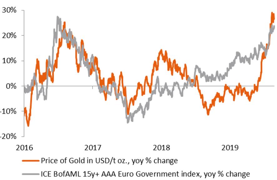 Zweitens wird die Anlagewelt mit negativen Renditen für mehr als ein Viertel der ausstehenden Investment-Grade-Anleihen und einer zusätzlichen Lockerung der Geldpolitik konfrontiert, so dass bei einem Gold-Exposure keine Opportunitätskosten mehr anfallen. Ein großes Manko bei physischen Edelmetallen als Anlageklasse sind fehlende Renditen, wie Dividenden für Aktionäre und Kupons für Anleihegläubiger. Letzteres hat jedoch an Bedeutung verloren, da das Kaufen und Halten bis zur Fälligkeit heutzutage bedeuten kann, in Vermögenswerte zu investieren, die mit Sicherheit an Wert verlieren. Da die jüngste Wertentwicklung von Gold an langlebige Anleihen mit AAA-Rating gekoppelt und deren Rendite unter Null gesunken ist, erscheint die relative Attraktivität der Edelmetalle in neuem Glanz.