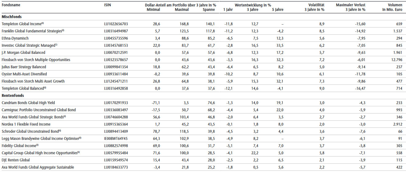 In dieser Tabelle finden Sie global aufgestellte Renten- und Mischfonds mit den am stärksten schwankenden Dollar-Anteilen, bewusstem Währungsmanagement und mindestens einer schwarzen Null auf Sicht von drei Jahren.