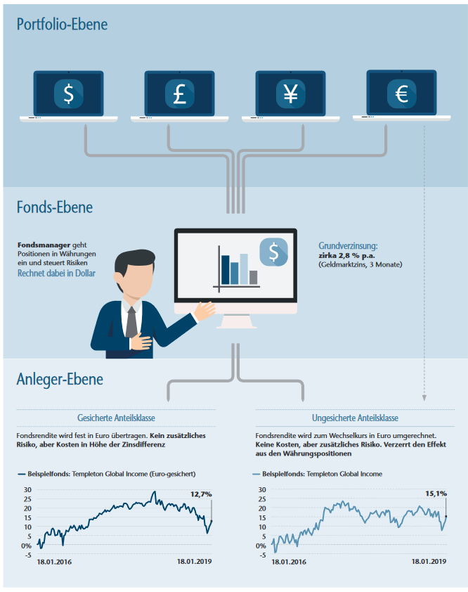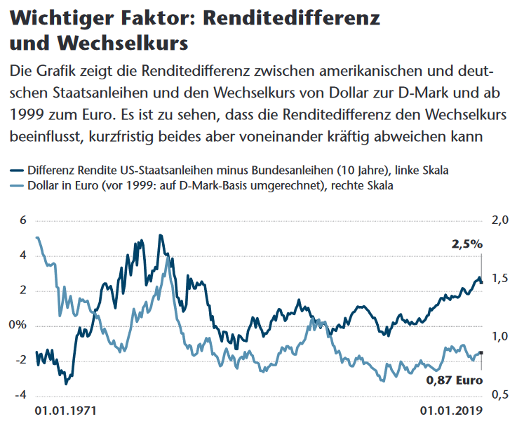 Dann stellt sich nämlich die Frage, ob man das in Dollar erzielte Anlageergebnis fest in Euro übertragen lässt. Das leisten währungsgesicherte Klassen, es kostet aber Sicherungsgebühren in Höhe der Zinsdifferenz zwischen ursprünglicher und gewünschter Währung. Experten rechnen zurzeit mit über 3 Prozent pro Jahr, um einen Dollar-Fonds in den Euro rüberzusichern (siehe auch Infografik unten).