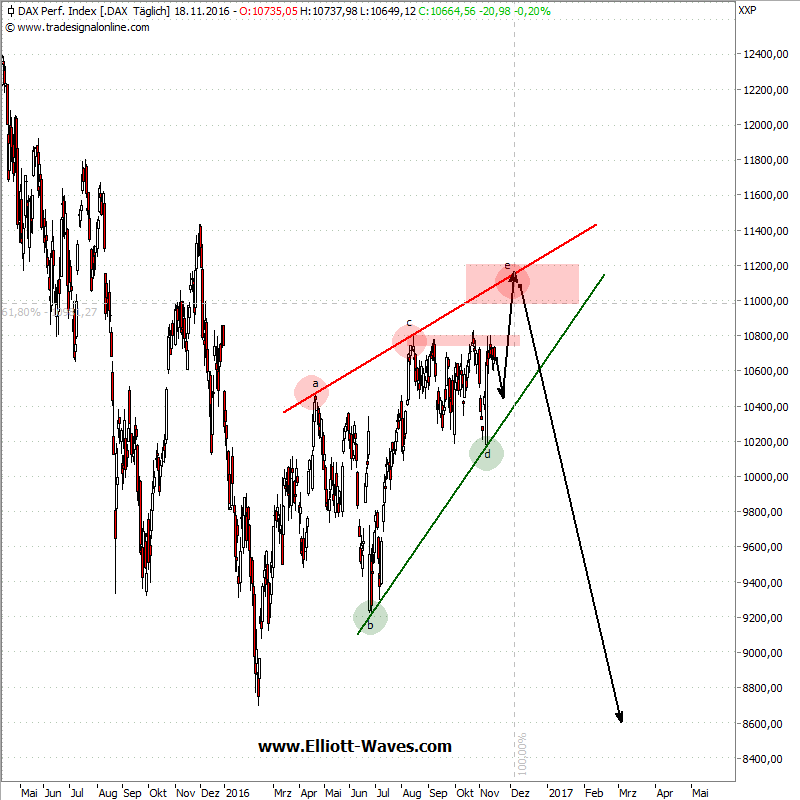 Kurzfristig besteht vielleicht noch etwas Korrekturpotenzial bis ca. 10.500/400. Ab dort sollte dann die zweite Phase der e-Welle einsetzen und den steigenden DAX-Keil bis 11.000/11.200 komplettieren. Der Bruch des “Abwärtstrends”, neue Jahreshochs und ein Sprung zurück in den 11.000er Bereich sowie der Sprung in die 2016er-Gewinnzone wird dann medial sicher wieder ausgiebig gefeiert werden.