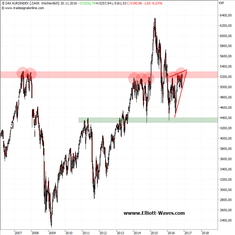 Dieser lässt sich bis 2007/2008 zurückverfolgen und spielte auch schon 2014 drei Mal eine Rolle. Nun steht der DAX Kursindex wieder an dieser Schwelle. Nachdem diese Zone schon im April, August und Oktober deutlich abgelehnt wurde, wird ein nachhaltiger Ausbruch über die 5.300er Marke immer unwahrscheinlicher. Zumal sich auch hier ein spitz zulaufender Keil bildet, der an dieser charttechnisch wichtigen Stelle eher einen Ausbruch nach unten auf ca. 4.400/300, dort verläuft eine langfristige Unterstützungszone, andeutet.