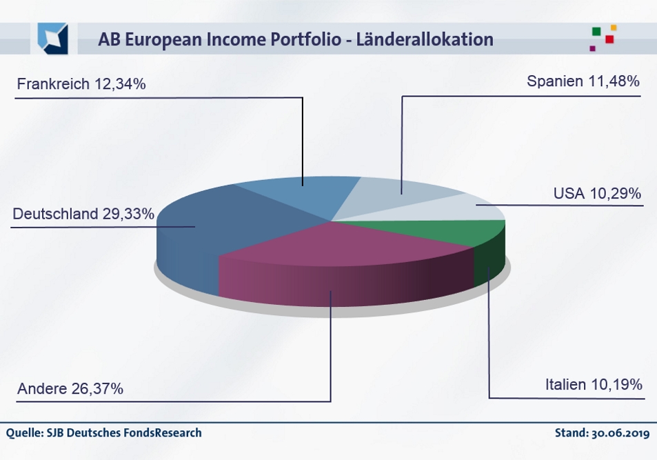 Bei der Länderallokation hat Anleihenstratege Kjaersgaard seinen Schwerpunkt auf Deutschland gesetzt, wo 29,33 Prozent des FondsVermögens investiert sind. Auch die größte Einzelposition des Fonds stammt hierher; es ist eine bis 2027 laufende Bundesanleihe mit einem Kupon von 6,50 Prozent. Frankreich besitzt einen Portfolioanteil von 12,34 Prozent, Spanien ist mit 11,48 Prozent des FondsVolumens vertreten. In den USA ist der Anleihenfonds mit 10,29 Prozent engagiert, Rentenpapiere aus Italien besitzen einen Portfolioanteil von 10,19 Prozent. Abgerundet wird die geographische Allokation des Alliance Bernstein-Produktes durch einen 26,37-prozentigen Bestand in sonstigen Ländern.