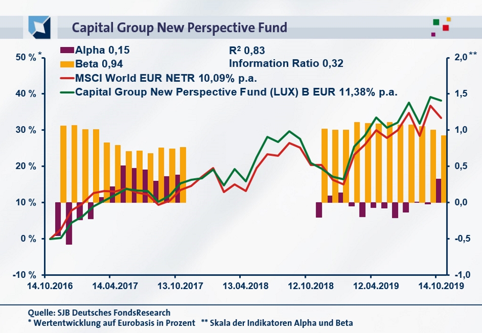 Per 14. Oktober 2019 hat der Capital Group New Perspective Fund über drei Jahre eine kumulierte Wertentwicklung von +38,16 Prozent auf Eurobasis aufzuweisen, was einer Rendite von +11,38 Prozent p.a. entspricht. Eine sehr attraktive Performance, die zudem das Ergebnis der weltweit gestreuten Benchmark um knapp fünf Prozentpunkte übertrifft: Der MSCI World EUR NETR kann lediglich mit einer Gesamtrendite von +33,42 Prozent bzw. einem Ergebnis von +10,09 Prozent jährlich in Euro aufwarten. Beim Wechsel des Vergleichszeitraums auf ein Jahr kann der Capital Group-Aktienfonds seine Vormachtstellung verteidigen und eine ähnlich hohe Mehrrendite gegenüber der SJB-Benchmark generieren: Während das aktiv gemanagte Investmentprodukt ein Plus von +14,27 Prozent auf Eurobasis erwirtschaftet, verzeichnet der MSCI-Referenzindex eine Wertentwicklung von +10,78 Prozent in Euro. Der in beiden Zeithorizonten erzielte Renditevorsprung gegenüber dem keinesfalls leicht zu schlagenden MSCI World liefert einen klaren Qualitätsbeweis für den Fonds mit seinen neuen Perspektiven: Die Strategie, sich auf wachstumsstarke Titel global agierender Konzerne zu konzentrieren, die in besonderem Maße von den neuen Trends rund um die Millennials profitieren, geht ganz offensichtlich auf.