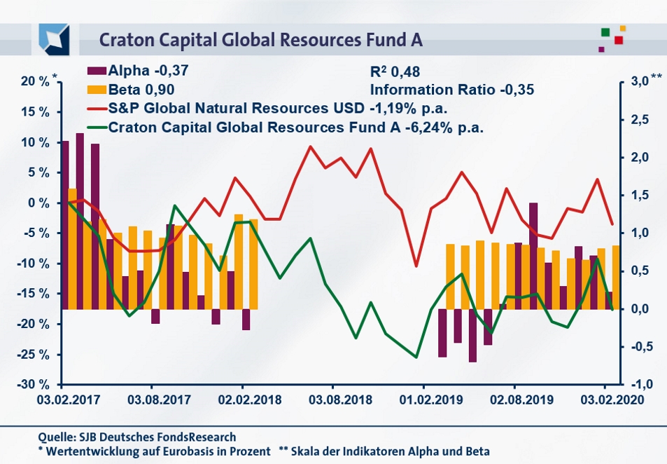 Per 03. Februar 2020 hat der Craton Capital Global Resources Fund über drei Jahre eine kumulierte Wertentwicklung von -17,59 Prozent in Euro aufzuweisen. Dies entspricht einer Rendite von -6,24 Prozent p.a. und demonstriert, wie problematisch die Aktienmärkte der letzten Jahre für Rohstofftitel waren. Auch der SJB-Vergleichsindex kommt nicht umhin, mit einer Performance im negativen Bereich aufzuwarten: Der S&P Global Natural Resources Index hat im selben Zeitraum eine Wertentwicklung von -3,52 Prozent bzw. eine Jahresrendite von -1,19 Prozent auf Eurobasis zu verzeichnen. Beim Wechsel auf den kurzfristigen Betrachtungshorizont stellt sich das Szenario ähnlich dar – sowohl das FondsProdukt als auch die Benchmark liegen mit ihrer Rendite „unter Wasser“. Doch diesmal gelingt es FondsManager Bachmann, die bessere Wertentwicklung als der Referenzindex zu erwirtschaften: Über ein Jahr generiert der Craton-Fonds eine nur hauchdünn negative Performance von -0,19 Prozent in Euro, während der globale S&P-Rohstoffaktienindex mit einem noch schwächeren Ergebnis von -2,61 Prozent aufwartet. Kurzfristig erreicht der Marktstratege eine Mehrrendite zum Vergleichsindex, längerfristig liegt er merklich im Hintertreffen. Da der Performancezeitraum über drei Jahre schwerer wiegt, erreicht das Craton-Produkt insgesamt nur den zweiten Platz im Renditevergleich – wie wirkt sich dies auf die Alpha-Werte aus?