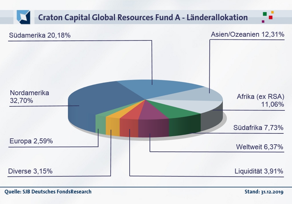 In der geographischen Allokation des Craton Capital Global Resources Fund liegt Nordamerika mit 32,70 Prozent auf dem ersten Platz. 20,18 Prozent des FondsVolumens sind in südamerikanische Aktien investiert, 12,31 Prozent des Portfolios hat FondsManager Bachmann in Titel aus Asien und Ozeanien allokiert. 11,06 Prozent des Rohstoffaktien-Fonds werden in afrikanischen Rohstofftiteln (ohne Südafrika) gehalten, 7,73 Prozent des FondsVermögens sind in Aktien aus der Republik Südafrika angelegt. Rohstoff- und Minenwerte aus anderen Ländern weltweit repräsentieren 6,37 Prozent der FondsBestände. Die Cashquote des Craton-Fonds liegt per Ende Dezember 2019 bei 3,91 Prozent.