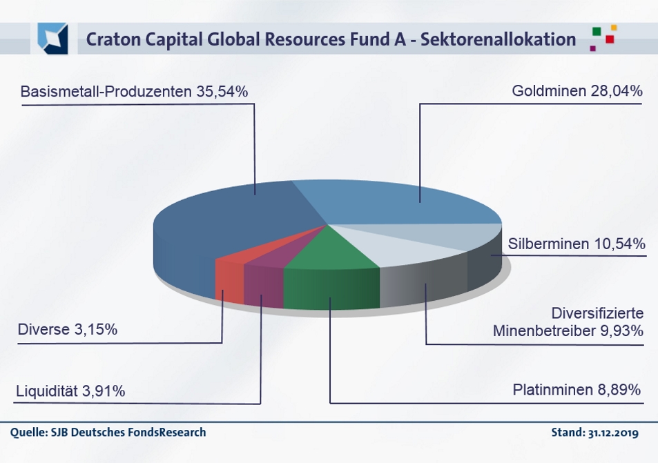 In der Branchengewichtung dominieren die Produzenten von Basismetallen mit einem Anteil von 35,54 Prozent, gefolgt von den Goldminentiteln (28,04 Prozent). Silberminen decken 10,54 Prozent der FondsBestände ab, diversifizierte Minenbetreiber sind mit 9,93 Prozent gewichtet. Platinminen besitzen einen Anteil von 8,89 Prozent im FondsPortfolio, andere Sektoren bringen es auf 3,15 Prozent. Unter den Top 10 des Rohstoff-Fonds befinden sich der in den Bereichen Platin, Kupfer und Eisenerz tätige britische Rohstoff-Konzern Anglo American sowie das kanadische Bergbau-Unternehmen First Quantum Minerals (Erze, Kupfer und Gold). Günstig bewertete Goldproduzenten wie die kanadische Torex Gold Resources sowie das ebenfalls in Kanada beheimatete Explorations-Unternehmen Osisko Mining Corp komplettieren die Portfoliostruktur, in der die Übergewichtung von Kupferproduzenten jüngst positiv zur Renditeentwicklung beitrug.