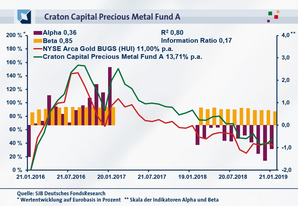 Per 21. Januar 2019 hat der Craton Capital Precious Metal Fund über drei Jahre eine kumulierte Wertentwicklung von +47,09 Prozent in Euro aufzuweisen, was einer Rendite von +13,71 Prozent p.a. entspricht. Ein attraktives Performanceergebnis des Edelmetallaktienfonds, wie die Gegenüberstellung mit der ausgewählten Benchmark bestätigt: Der NYSE Arca Gold BUGS Index hat im selben Zeitraum eine Gesamtperformance von 36,81 Prozent bzw. eine Jahresrendite von +11,00 Prozent auf Eurobasis zu verzeichnen. Der kräftige Renditevorsprung des Craton-Produktes demonstriert die Qualität des FondsManagements, die sich gerade innerhalb des volatilen Goldminensektors beweist. Beim Wechsel auf den kurzfristigen Betrachtungshorizont wird das positive Szenario leicht eingetrübt: Über ein Jahr verzeichnet der Craton-Fonds mit -22,06 Prozent in Euro die stärkeren Kurseinbußen als die NYSE-Benchmark, die sich mit einem Minus von -17,42 Prozent begnügt. Angesichts der Fokussierung des Produktes auf den längerfristigen Anlagehorizont und dem höher zu gewichtenden Performancevorsprung über drei Jahre ist der Bachmann-Fonds Gesamtsieger im Renditevergleich – wie wirkt sich dies auf die Alpha-Werte aus?