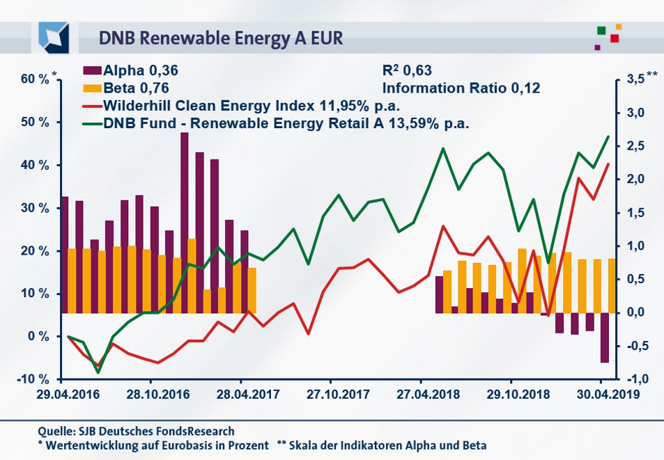 Per 30. April 2019 hat der DNB Renewable Energy über drei Jahre eine kumulierte Wertentwicklung von +46,63 Prozent in Euro erzielt, was einer Rendite von +13,59 Prozent p.a. entspricht. Ein sehr attraktives Performanceergebnis, das den WilderHill Clean Energy Index hinter sich lässt: Die SJB-Benchmark kommt für drei Jahre auf einen Wertzuwachs von +40,89 Prozent bzw. ein jährliches Plus von +11,95 Prozent auf Eurobasis. Beim Wechsel auf den kurzfristigen Zeithorizont muss der aktiv gemanagte DNB-Fonds hingegen den ersten Platz räumen: Hier generiert der Renewable Energy eine Performance von +9,30 Prozent, während das WilderHill-Kursbarometer mit einer Rendite von +23,88 Prozent aufwarten kann. Da die längerfristige Mehrrendite höher zu gewichten ist, hat der DNB-Fonds im Performancevergleich die Nase vorn. Mit ihrer individuellen Titelselektion gelingt es FondsManager Jon Sigurdsen und seinem Kollegen Christian Rom, im langfristigen Anlagehorizont eine nachhaltige Outperformance zur Benchmark zu generieren.