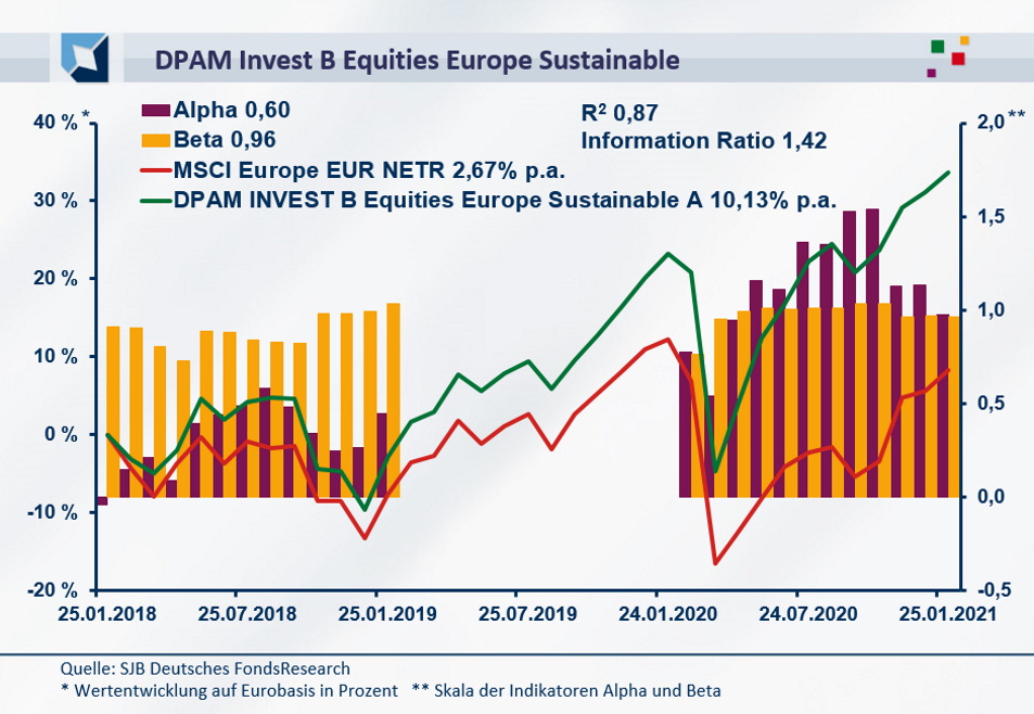 Per 25. Januar 2021 hat der DPAM Invest B Equities Europe Sustainable über drei Jahre eine kumulierte Wertentwicklung von +33,61 Prozent in Euro aufzuweisen, was einer Rendite von +10,13 Prozent p.a. entspricht. Mit diesem attraktiven Performanceergebnis wird die Wertentwicklung des MSCI Europe EUR NETR klar geschlagen: Das Kursbarometer für Europas Aktienmarkt bringt es im selben Zeitraum auf eine Gesamtrendite von +8,25 Prozent auf Eurobasis bzw. ein Ergebnis von +2,67 Prozent jährlich. Beim Wechsel des Vergleichszeitraums auf ein Jahr kann der DPAM-Fonds wiederum den MSCI-Vergleichsindex deutlich übertreffen: Mit einer Wertentwicklung von +8,41 Prozent liegt er klar im grünen Bereich, während sich die Benchmark mit einer negativen Rendite von -3,54 Prozent in Euro begnügen muss. Die Outperformance des nach ESG-Kriterien zusammengestellten FondsPortfolios gegenüber dem europäischen Aktienmarkt ist demnach beträchtlich und liegt zwischen sieben und zwölf Prozentpunkten jährlich. Diese attraktive Mehrrendite unterstreicht die Qualität des FondsManagements und macht den Fonds zum Gesamtsieger im Performancewettstreit.