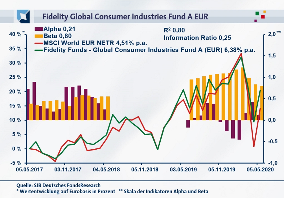 Per 05. Mai 2020 hat der Fidelity Global Consumer Industries Fund über drei Jahre eine kumulierte Wertentwicklung von +20,40 Prozent in Euro erwirtschaften können. Eine attraktive Performance, die einer Rendite von +6,38 Prozent p.a. entspricht. Damit fällt die Wertentwicklung des aktiv gemanagten FondsProduktes klar besser als diejenige des passiven Vergleichsindex MSCI World EUR NETR aus, der im Dreijahreshorizont eine Performance von +14,15 Prozent auf Eurobasis bzw. eine Rendite p.a. von +4,51 Prozent generiert. Auch kurzfristig liegt der Fidelity-Fonds mit seiner Wertentwicklung vor dem weltweiten Aktienmarkt: Über ein Jahr hat FondsManagerin Wynimko mit ihrem Aktienportfolio ein hauchdünn negatives Ergebnis von -0,21 Prozent in Euro zu verzeichnen, während der MSCI-Referenzindex ein Minus von -2,58 Prozent generierte und somit stärker in die roten Zahlen rutschte. Die in beiden untersuchten Zeithorizonten erzielte Mehrrendite des Konsumaktien-Fonds macht das Fidelity-Produkt zum klaren Sieger im Performancewettbewerb mit der MSCI-Benchmark – fallen die Alpha-Werte entsprechend positiv aus?