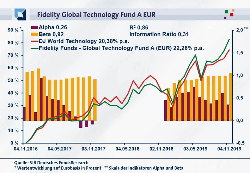 Per 06. November 2019 hat der Fidelity Global Technology Fund über drei Jahre eine kumulierte Wertentwicklung von +82,77 Prozent auf Eurobasis aufzuweisen, was einer Rendite von +22,26 Prozent p.a. entspricht. Eine sehr attraktive Performance, die sich zudem klar besser als die Wertentwicklung des Dow Jones World Technology Index darstellt: Die SJB-Benchmark wartet über drei Jahre mit einer Gesamtrendite von +74,46 Prozent in Euro auf, die einem Ergebnis von +20,38 Prozent p.a. gleichkommt. Beim Wechsel auf die Jahresbetrachtung behält das Fidelity-Produkt seinen Renditevorsprung zum Referenzindex: Mit einem Jahresergebnis von +29,89 Prozent fällt die Performance des Technologiefonds klar besser als die des Dow Jones-Vergleichsindex von +23,58 Prozent aus. Das hohe Performanceplus über beide untersuchten Zeiträume führt dazu, dass der Fidelity Global Technology Fund im Renditewettbewerb den ersten Platz belegt. Wie wirkt sich dies auf die Alpha-Werte des FondsProduktes aus?