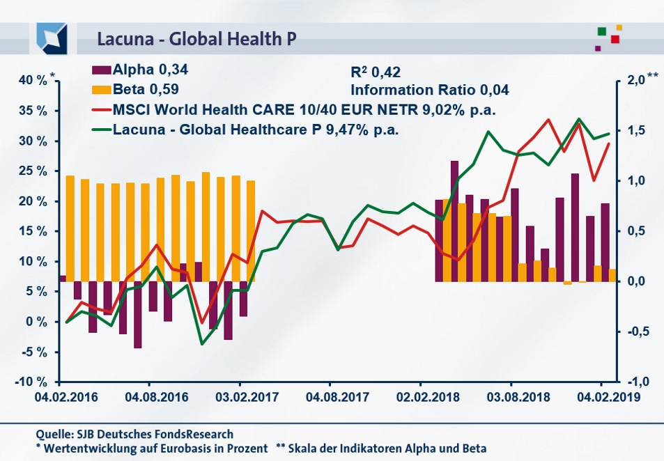 Per 04. Februar 2019 hat der Lacuna Global Health P über drei Jahre eine kumulierte Wertentwicklung von +31,20 Prozent in Euro aufzuweisen, was einer Rendite von +9,47 Prozent p.a. entspricht. Damit liegt das Investmentprodukt gegenüber dem MSCI World Health Care 10/40 EUR NETR als Vergleichsindex vorn: Die SJB-Benchmark wartet über drei Jahre mit einer Gesamtrendite von +29,60 Prozent auf Eurobasis auf, die einem jährlichen Ergebnis von +9,02 Prozent gleichkommt. Beim Wechsel auf die Jahresbetrachtung wird das Lacuna-Produkt von Platz eins im Performanceranking verdrängt: Mit einer Jahresrendite von +11,03 Prozent in Euro fällt die Wertentwicklung des weltweit anlegenden Gesundheitsfonds etwas schwächer als die des MSCI-Vergleichsindex von +12,99 Prozent aus. Da die längerfristig erzielte Überrendite aber stärker zu gewichten ist als die kurzfristige Underperformance, geht FondsManager Engelhardt als Gesamtsieger aus dem Performancewettstreit hervor. Welche Konsequenzen hat dies für die Alpha-Werte des Fonds?