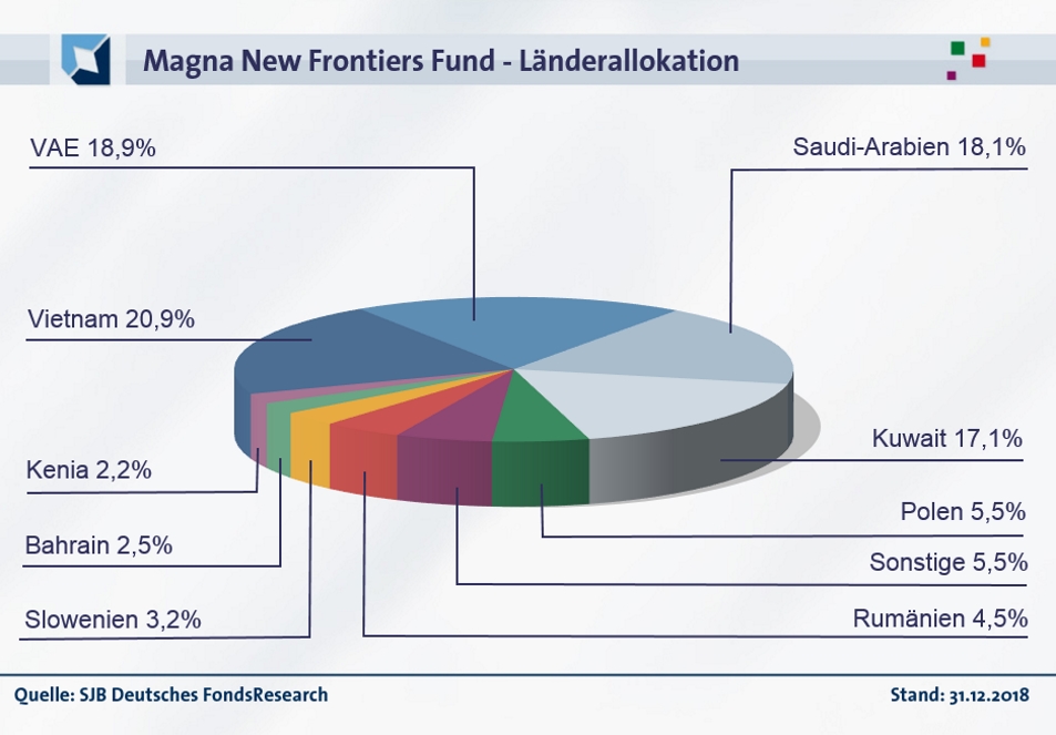 In der Länderallokation des Magna New Frontiers Fund liegt Vietnam mit 20,9 Prozent Portfolioanteil vorn. Nach den Wirtschaftsreformen der letzten Jahre überzeugt Vietnam als einer der am schnellsten wachsenden Grenzmärkte, der zudem durch die Reform des Aktienmarktes Auftrieb erhält. Knapp dahinter folgen die Vereinigten Arabischen Emirate (VAE) mit 18,9 Prozent, ein geographischer Schwerpunkt, der den neuen Fokus von FondsManager Böttcher auf die Märkte der arabischen Halbinsel belegt. Den dritten Platz in der Ländergewichtung belegt Saudi-Arabien, wo 18,1 Prozent des FondsVermögens investiert sind – Kursfantasie besteht hier vor allem im Kontext der jüngsten Aufnahme des Landes in den MSCI Emerging Markets. Kuwait macht 17,1 Prozent der FondsBestände aus, in Polen sind 5,5 Prozent der Anlegergelder investiert. Rumänien bringt es auf einen Anteil von 4,5 Prozent am FondsVolumen. In Slowenien sind 3,2 Prozent der Bestände angelegt, kleinere Positionen in Bahrain (2,5 Prozent) sowie in Kenia (2,2 Prozent) runden die geographische Zusammensetzung des Fonds ab. Sonstige Frontier Markets repräsentieren 5,5 Prozent des FondsPortfolios.