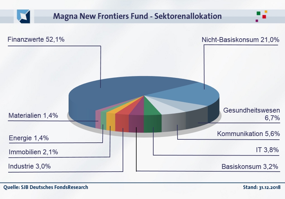 Bei der Branchengewichtung des Magna-Fonds liegt der Schwerpunkt auf Finanztiteln, die 52,1 Prozent der FondsBestände ausmachen. Aktien von Unternehmen des Nicht-Basiskonsumsektors nehmen mit 21,0 Prozent den zweiten Platz in der Branchenallokation ein. Merklich geringer sind Firmen aus dem Gesundheitswesen vertreten, die einen Anteil von 6,7 Prozent am FondsVermögen besitzen. Durchschnittlich stark ist die Gewichtung von Kommunikationstiteln (5,6 Prozent), IT-Werten (3,8 Prozent) sowie von Industrieaktien (3,0 Prozent). Abgerundet wird das nach Sektorenaufteilung breit gestreute Portfolio durch Immobilienunternehmen (2,1 Prozent), Energietitel sowie Grundstoffproduzenten (jeweils 1,4 Prozent). Zu den größten Einzelposition des Portfolios gehören die Aktie von Humansoft, einem privaten Weiterbildungsunternehmen aus Kuwait, sowie NMC Healthcare, eine an der Londoner Börse notierte Firma für Gesundheitsdienstleistungen aus den Vereinigten Arabischen Emiraten (VAE). In Vietnam ist FondsManager Böttcher vom Hafen- und Logistikdienstleister Gemadept sowie der Mobile World Group besonders überzeugt, dem wichtigsten Betreiber von Handelsketten für Unterhaltungselektronik sowie Lebensmittel in Vietnam.