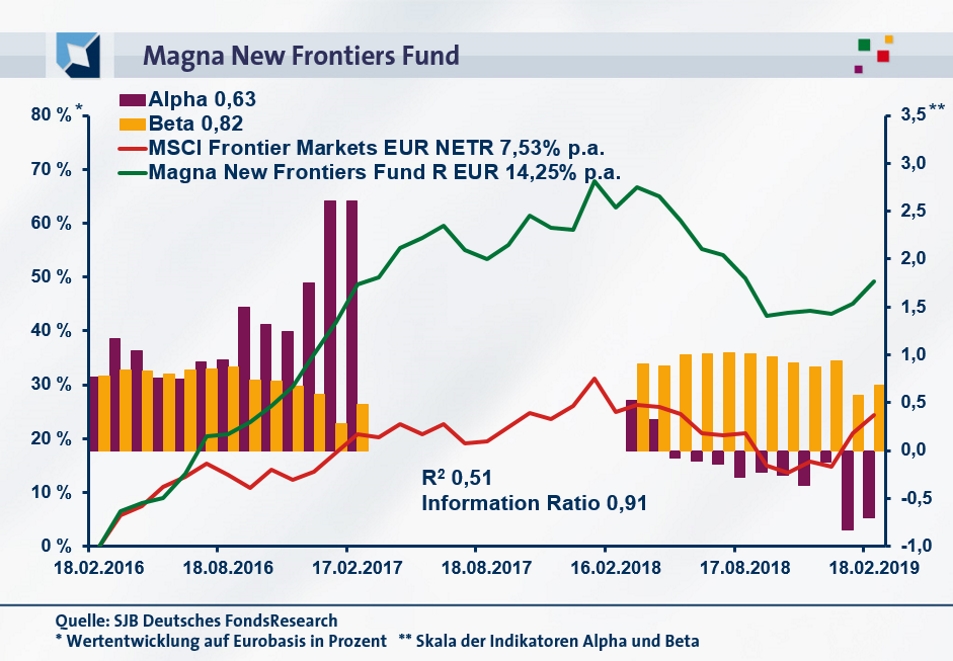 Per 18. Februar 2019 hat der Magna New Frontiers Fund über drei Jahre eine kumulierte Wertentwicklung von +49,18 Prozent in Euro aufzuweisen, was einer Rendite von +14,25 Prozent p.a. entspricht. Eine überzeugende Wertentwicklung für das FondsProdukt aus dem Hause Fiera Capital, wie der kräftige Renditevorsprung gegenüber der Benchmark MSCI Frontier Markets EUR NETR beweist. Der weltweit investierende Grenzmärkteindex verzeichnet über drei Jahre nur eine Euro-Gesamtrendite von +24,35 Prozent bzw. ein jährliches Renditeergebnis von +7,53 Prozent. Beim Wechsel auf die Jahresbetrachtung büßt FondsManager Böttcher seinen Performancevorsprung ein: Mit einer Wertentwicklung von -8,43 Prozent stellt sich die Performance des Magna-Fonds schwächer als diejenige der Benchmark dar (MSCI Frontier Markets: -0,46 Prozent). Da der Magna New Frontiers jedoch längerfristig die klar bessere Renditeleistung erbringt und mit einem rund doppelt so hohen Plus über drei Jahre aufwartet, ist der aktiv gemanagte Fonds Gesamtsieger im Wettstreit mit dem passiven Referenzindex.