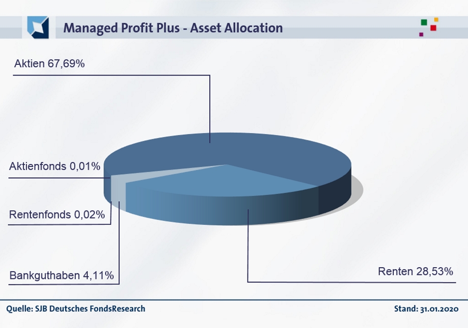 In der Vermögensallokation des Managed Profit Plus sind Aktien mit 67,69 Prozent Anteil am FondsVolumen die 2020 mit Abstand am stärksten gewichtete Assetklasse. Rentenpapiere, die 28,53 Prozent des FondsVermögens abdecken, liegen per Ende Januar auf Platz zwei der Asset Allocation. Bankguthaben repräsentieren 4,11 Prozent der FondsBestände, Rentenfonds (0,02 Prozent) sowie Aktienfonds anderer Anbieter (0,01 Prozent) machen nur homöopathische Dosen des Portfolios aus.