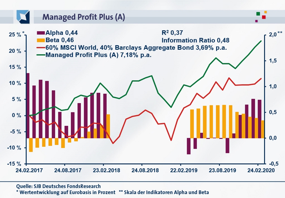 Per 24. Februar 2020 hat der Managed Profit Plus über drei Jahre eine kumulierte Wertentwicklung von +23,12 Prozent in Euro aufzuweisen, was einer Rendite von +7,18 Prozent p.a. entspricht. Ein attraktives Performanceergebnis für den ausgewogenen Mischfonds, wie die Gegenüberstellung zum SJB-Vergleichsindex verdeutlicht: Die Kombination der beiden weltweit anlegenden Aktien- und Anleihenindizes wartet mit einer deutlich schwächeren Gesamtrendite von +11,47 Prozent bzw. einem Ergebnis von +3,69 Prozent jährlich auf Eurobasis auf. Beim Wechsel des Vergleichszeitraums auf ein Jahr kann der MPP-Fonds seinen Spitzenplatz verteidigen. Die Performance von +12,49 Prozent in Euro liegt erneut über dem Renditeergebnis, das die Benchmark aus 60 Prozent MSCI World EUR NETR und 40 Prozent Barclays Global Aggregate Bond erzielte: Die „Kombi“ erwirtschaftete über die letzten zwölf Monate eine positive Wertentwicklung von +9,03 Prozent auf Eurobasis. In beiden Zeithorizonten generiert der Managed Profit Plus einen nachhaltigen Performancevorsprung zum SJB-Referenzindex, der auch in seiner absoluten Höhe von rund 3,5 Prozentpunkten jährlich zu überzeugen vermag. Was tragen die Alpha-Werte zur FondsAnalyse bei?