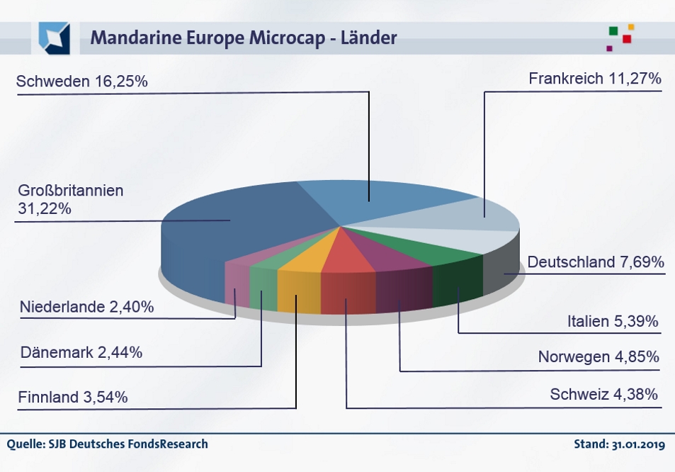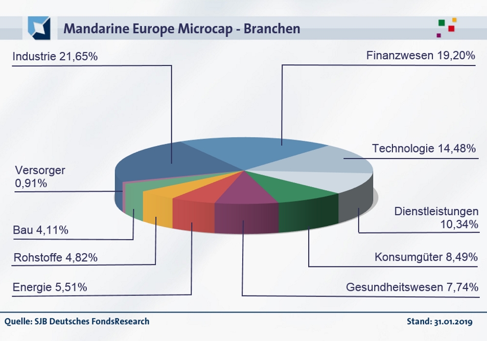 In der Sektorengewichtung des europäischen Microcap-Fonds befinden sich Industrietitel mit 21,65 Prozent Portfolioanteil auf dem ersten Platz. Unter den Top 10 wird der Sektor durch die finnische Poyry-Aktie (Ingenieur-Dienstleistungen) sowie den britischen Verpackungsspezialisten Macfarlane Group vertreten. Auf Platz zwei der Branchenallokation liegen Finanztitel, die 19,20 Prozent des FondsVolumens einnehmen, Platz drei in der Branchenstruktur geht an den Technologiebereich mit 14,48 Prozent. Durchschnittlich stark gewichtet innerhalb des FondsPortfolios sind der Dienstleistungssektor mit 10,34 Prozent sowie Konsumtitel mit 8,49 Prozent Anteil am FondsVolumen. Es folgen Aktien aus dem Gesundheitswesen, die 7,74 Prozent des FondsVermögens stellen. Energiewerte decken 5,51 Prozent der FondsBestände ab. Komplettiert wird der Branchenmix des Mandarine-Fonds durch Rohstofftitel (4,82 Prozent) sowie Bauaktien (4,11 Prozent). Per Ende Januar nimmt der Cashbestand 2,44 Prozent des FondsVolumens ein.