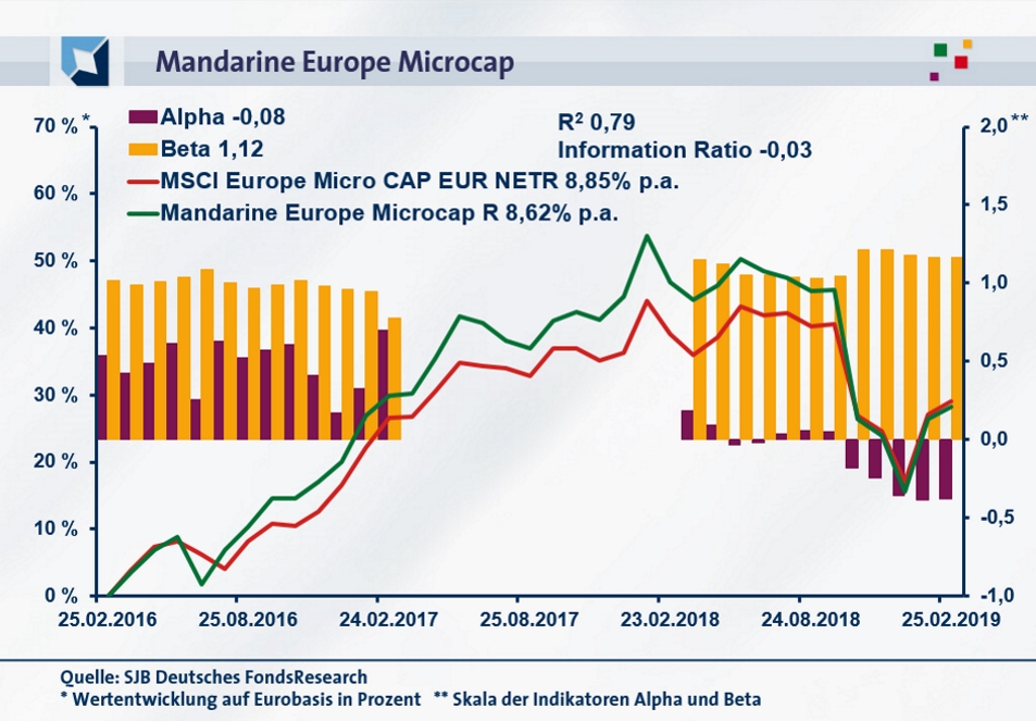 Per 25. Februar 2019 hat der Mandarine Europe Microcap über drei Jahre eine kumulierte Wertentwicklung von +28,19 Prozent in Euro aufzuweisen, was einer Rendite von +8,62 Prozent p.a. entspricht. Eine attraktive Performance, die etwa auf der Höhe des MSCI Europe Micro Cap EUR NETR liegt: Der europäische Vergleichsindex kann mit einer Gesamtrendite von +29,00 Prozent in Euro bzw. einem Ergebnis von +8,85 Prozent jährlich aufwarten. Beim Wechsel des Vergleichszeitraums auf ein Jahr fällt das Mandarine-Produkt im Renditevergleich zurück: Mit einer Wertentwicklung von -12,73 Prozent besitzt der Fonds das höhere Minus gegenüber dem SJB-Vergleichsindex (MSCI Europe Micro Cap EUR NETR: -7,20 Prozent). Mittelfristig etwa gleich, kurzfristig aber schwächer – insgesamt ist der Mandarine-Fonds im Performancewettstreit mit dem europäischen Aktienmarkt für Microcaps nur zweiter Sieger. Wie bewertet die Alpha-Analyse das aktive Portfoliomanagement von FondsManager Sébastien Lagarde?