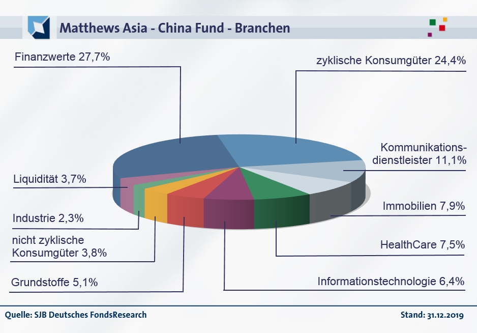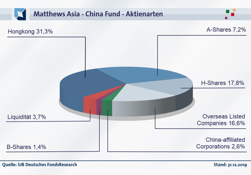 In der geographischen Allokation des Matthews Asia – China Fund liegen Aktien aus der Sonderverwaltungszone Hongkong mit 31,3 Prozent Anteil am FondsVermögen auf Platz eins. Den zweiten Platz belegen chinesische A-Aktien von den Festland-Börsen, die 26,6 Prozent der FondsBestände ausmachen. In Hongkong notierte Aktien chinesischer Unternehmen, sogenannte H-Aktien, decken 17,8 Prozent des FondsVolumens ab. Dahinter folgen die in Übersee registrierten Overseas Listed Companies (OL), in die 16,6 Prozent des China-Produktes investiert sind. China-affiliated Corporations (CAC) repräsentieren 2,6 Prozent des Matthews Asia-Fonds, in chinesische B-Aktien sind 1,4 Prozent der Anlegergelder investiert. Abgerundet wird die Portfolioallokation durch einen Cashbestand von 3,7 Prozent per Ende Dezember.