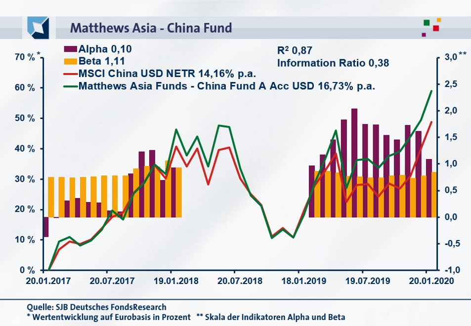 Per 20. Januar 2020 hat der Matthews Asia – China Fund über drei Jahre eine kumulierte Wertentwicklung von +59,05 Prozent in Euro aufzuweisen, was einer Rendite von +16,73 Prozent p.a. entspricht. Eine sehr attraktive Wertentwicklung, was sich auch in der Gegenüberstellung zur Performance des SJB-Referenzindex erweist: Der MSCI China USD NETR wartet über drei Jahre mit einer Gesamtrendite von +48,79 Prozent auf Eurobasis auf, die einem Ergebnis von +14,16 Prozent p.a. gleichkommt. Der Renditevorsprung von mehr als 2,5 Prozentpunkten jährlich fällt überzeugend aus. Beim Wechsel auf den kurzfristigen Zeithorizont erhält sich die Mehrrendite des Matthews Asia-Fonds in etwa gleicher Höhe: Mit einer Jahresrendite von +20,52 Prozent fällt die Performance erneut besser als die des MSCI-Vergleichsindex von +18,46 Prozent aus. Das in beiden Zeithorizonten erzielte Performanceplus zur Benchmark macht das China-Produkt von Matthews Asia zum klaren Sieger im Renditewettbewerb. Wie schlägt sich dies in den Alpha-Werten nieder?