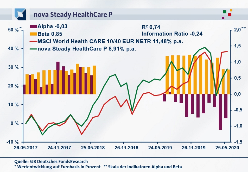 Per 25. Mai 2020 hat der nova Steady HealthCare über die letzten drei Jahre eine kumulierte Wertentwicklung von +29,90 Prozent in Euro aufzuweisen. Ein attraktives Ergebnis, das vom MSCI World Health Care 10/40 EUR NETR noch übertroffen wird: Der Referenzindex für den globalen Gesundheitssektor hat im selben Zeitraum eine positive Wertentwicklung von +38,58 Prozent auf Eurobasis generiert. Die Zahlen entsprechen einer Rendite von +8,91 Prozent p.a. beim Fonds gegenüber +11,48 Prozent p.a. beim Vergleichsindex. Auch beim kurzfristigen Performancevergleich schneidet die MSCI-Benchmark besser ab: Einer Wertentwicklung von +4,85 Prozent in Euro auf Seiten des aktiv gemanagten FondsProduktes steht eine Rendite von +20,13 Prozent der Aktien des weltweiten Gesundheitsmarktes gegenüber. Trotz der Underperformance im kurzfristigen Zeithorizont liefert der nova-Fonds solide Renditen im globalen Gesundheitssektor. Wie fallen die Alpha-Werte des Investmentproduktes aus?
