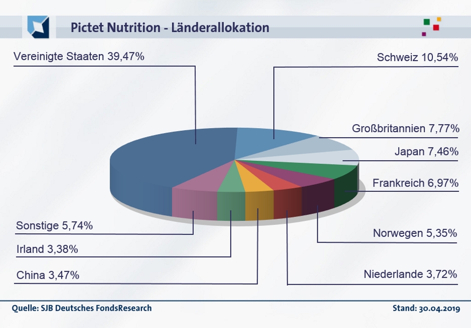 In der Ländergewichtung des Pictet – Nutrition bilden die USA mit 39,47 Prozent Portfolioanteil den klaren geographischen Schwerpunkt. Auf Platz zwei ist die Schweiz mit 10,54 Prozent platziert, 7,77 Prozent des FondsVolumens sind in Großbritannien investiert. Kaum geringer fallen die FondsBestände in Japan mit 7,46 Prozent aus, in Frankreich ist der Pictet-Themenfonds mit 6,97 Prozent gewichtet. Norwegen (5,35 Prozent) und die Niederlande (3,72 Prozent) befinden sich im hinteren Bereich der Länderallokation. Abgerundet wird die geographische Struktur des FondsVermögens durch kleinere Bestände in China (3,47 Prozent) und Irland (3,38 Prozent). Ernährungsaktien aus übrigen Ländern decken 5,74 Prozent des FondsPortfolios ab.