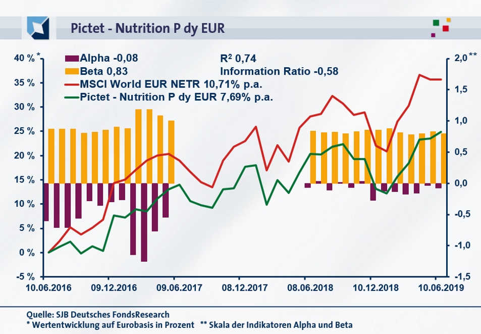 Per 13. Juni 2019 hat der Pictet – Nutrition über drei Jahre eine kumulierte Wertentwicklung von +24,89 Prozent in Euro aufzuweisen, was einer Rendite von +7,69 Prozent p.a. entspricht. Eine attraktive Performance, die vom MSCI World EUR NETR noch übertroffen wird: Der weltweit gestreute Aktienindex bringt es im selben Zeitraum auf eine Gesamtrendite von +35,68 Prozent in Euro bzw. ein Ergebnis von +10,71 Prozent jährlich. Beim Wechsel des Vergleichszeitraums auf ein Jahr bleibt das Bild unverändert: Das aktiv gemanagte Pictet-Produkt verzeichnet mit einer Wertentwicklung von +8,63 Prozent auf Eurobasis das schwächere Renditeergebnis als der MSCI-Vergleichsindex, der mit einem Plus von +10,21 Prozent aufwartet. Die Zahlen beweisen: Der traditionell defensive Nahrungsmittel- und Agrarsektor kann von seiner Performance her nicht mit dem technologielastigen MSCI World mithalten – zumindest nicht in einer generellen Aufschwungphase der Börsen, wie wir sie über die letzten Jahre gesehen haben. Für volatilere Märkte besteht die berechtigte Hoffnung, dass die moderate Minderrendite des Pictet-Branchenfonds zwischen 0,7 und 1,6 Prozentpunkten wieder kompensiert werden kann.