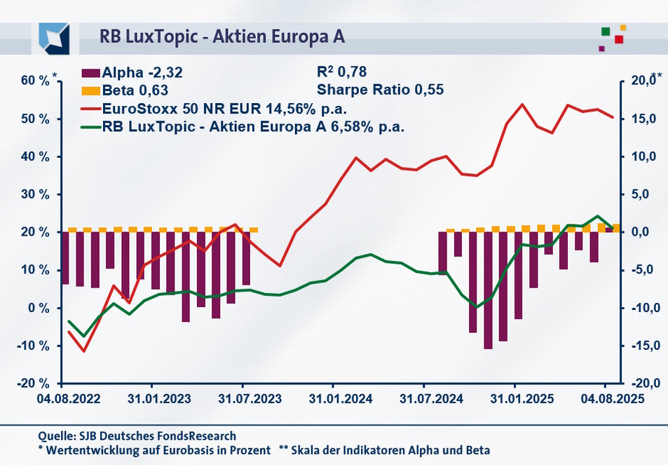 Per 04. August 2025 hat der RB LuxTopic – Aktien Europa über drei Jahre eine kumulierte Wertentwicklung von +21,08 Prozent in Euro aufzuweisen, was einer Rendite von +6,58 Prozent p.a. entspricht. Ein attraktives Performanceergebnis, das nur hauchdünn unter der historischen Durchschnittsrendite des Fonds von +6,64 Prozent jährlich liegt. Eine noch bessere Wertentwicklung hat der EuroStoxx 50 NR EUR erwirtschaftet: Das Kursbarometer für die Blue Chips der Eurozone bringt es im selben Zeitraum auf eine Gesamtrendite von +50,34 Prozent auf Eurobasis bzw. ein Ergebnis von +14,56 Prozent jährlich. Beim Wechsel des Vergleichszeitraums auf ein Jahr bleibt das grundsätzliche Bild für den RB-Fonds unverändert: Mit einer Wertentwicklung von +11,80 Prozent liegt der aktiv gemanagte Fonds hinter der Benchmark, die über eine Rendite von +15,78 Prozent in Euro verfügt. Die kurz- und mittelfristig schwächere Performanceentwicklung des Robert-Beer-Fonds macht klar, dass die Vorzüge der risikoadjustierten Strategie in der langfristigen Outperformance zum europäischen Aktienmarkt liegen. Wie fallen die Alpha-Werte des Fonds aus?