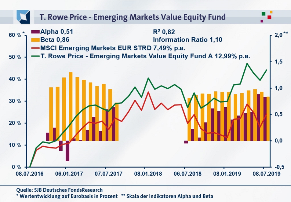 Per 8. Juli 2019 hat der T. Rowe Price – Emerging Markets Value Equity Fund über drei Jahre eine kumulierte Wertentwicklung von +44,26 Prozent in Euro aufzuweisen, was einer Rendite von +12,99 Prozent p.a. entspricht. Eine attraktive Wertentwicklung, wie der hohe Renditevorsprung gegenüber dem MSCI Emerging Markets EUR STRD beweist. Der weltweit investierende Schwellenländerindex verzeichnet über drei Jahre eine Gesamtrendite von +24,19 Prozent bzw. ein jährliches Renditeergebnis von +7,49 Prozent. Beim Wechsel auf die Jahresbetrachtung kann FondsManager Yeung erneut eine beeindruckende Mehrrendite generieren: Mit einer Wertentwicklung von +13,59 Prozent stellt sich die Performance des Emerging-Markets-Fonds über zehn Prozentpunkte besser als diejenige der Benchmark dar (MSCI Emerging Markets: +3,48 Prozent). Die Quintessenz des Renditevergleichs: der T. Rowe Price – Emerging Markets Value Equity Fund generiert in beiden Untersuchungszeiträumen die stärkere Wertentwicklung, weshalb der Fonds als eindeutiger Sieger aus dem Performancewettstreit hervorgeht.