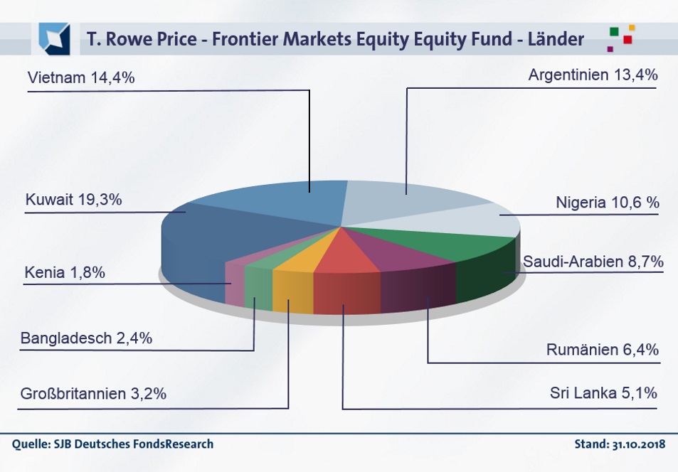 In der Länderallokation des T. Rowe Price Frontier Markets Equity Fund liegt Kuwait mit 19,3 Prozent Portfolioanteil vorn. Auf Platz zwei folgt Vietnam mit 14,4 Prozent – ein Markt, in dem sich zuletzt vor allem die Basiskonsumwerte positiv entwickelten. Den dritten Platz in der Ländergewichtung belegt Argentinien, wo 13,4 Prozent des FondsVermögens investiert sind. Nigeria bringt es auf einen Anteil von 10,6 Prozent am FondsVolumen, in Saudi-Arabien sind 8,7 Prozent des FondsVolumens angelegt. Durchschnittlich stark ist FondsManager Bell in Rumänien (6,4 Prozent) und Sri Lanka (5,1 Prozent) engagiert. Kleinere Positionen in Großbritannien (3,2 Prozent), Bangladesch (2,4 Prozent) sowie Kenia (1,8 Prozent) runden die geographische Zusammensetzung des Fonds ab. Per Ende Oktober liegt die Liquiditätsquote bei 6,6 Prozent.