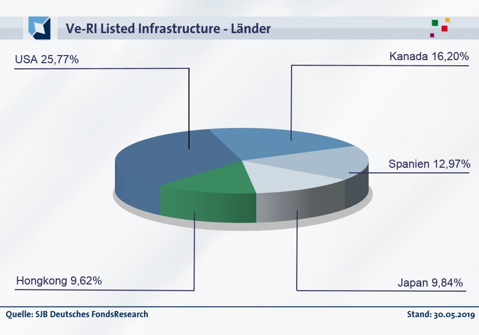 In der Länderallokation des Ve-RI Listed Infrastructure liegt die USA mit 25,77 Prozent Anteil am FondsVermögen auf Platz eins. Deutlich dahinter ist Kanada platziert, wo 16,20 Prozent der FondsBestände investiert sind. Auf dem dritten Platz der Länderaufteilung befindet sich Spanien mit 12,97 Prozent des FondsVolumens. Infrastruktur-Aktien aus Japan besitzen einen Portfolioanteil von 9,84 Prozent, Unternehmen aus Hongkong sind mit 9,62 Prozent gewichtet. Per 31. Mai 2019 liegt die Liquiditätsquote bei 2,86 Prozent.