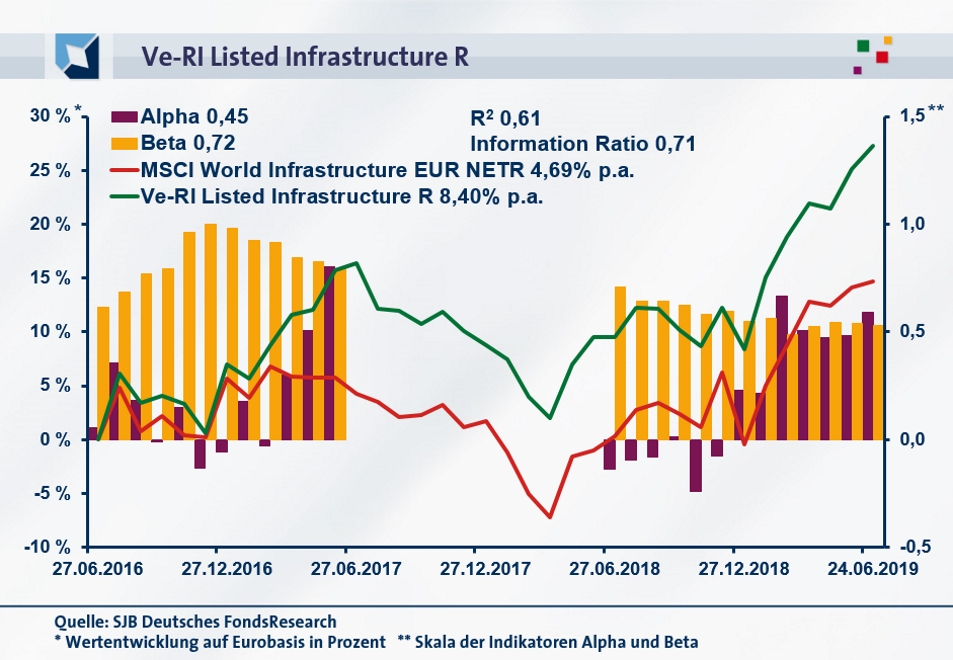 Per 24. Juni 2019 hat der Ve-RI Listed Infrastructure über drei Jahre eine kumulierte Wertentwicklung von +28,93 Prozent in Euro aufzuweisen. Eine attraktive Performance für den Infrastruktur-Aktienfonds, die einer Rendite von +8,84 Prozent p.a. entspricht. Der MSCI World Infrastructure als die von der SJB gewählte Benchmark kann hier nicht mithalten: Der Index legte im selben Zeitraum lediglich um +13,68 Prozentpunkte auf Eurobasis zu, was einem jährlichen Ergebnis von +4,37 Prozent gleichkommt. Beim Wechsel auf die Jahresbetrachtung kann der La Francaise-Fonds seinen Renditevorsprung vor dem Vergleichsindex verteidigen: Während der aktiv gemanagte Fonds ein positives Ergebnis von +15,90 Prozent in Euro verzeichnet, liegt die passive Benchmark mit +15,50 Prozent erneut darunter. Die durchweg erzielte und besonders im mittelfristigen Bereich hohe Mehrrendite von jährlich über vier Prozentpunkten macht den Fonds zum klaren Sieger im Performancevergleich und demonstriert die Qualität des selbst entwickelten Aktienselektionsmodells.